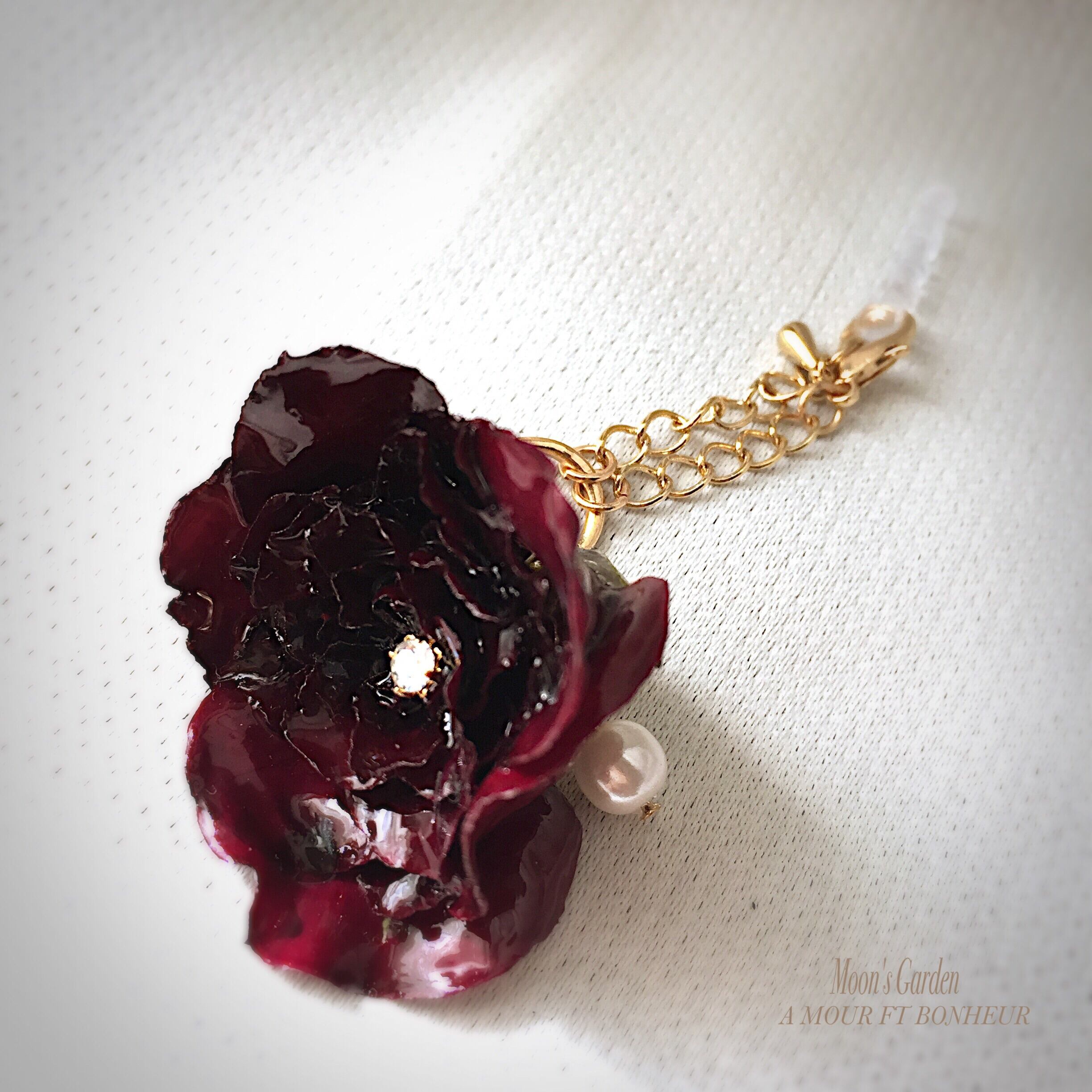このビロード調の濃赤色の花弁は加工するとブラックレッドになります。花弁の中心には月明かりのようにほのかな白い輝きを放つ上品なカラーのスワロフスキー・ムーンライトを使用し、エレガントな雰囲気に仕上げました。薔薇の下で揺れるパールも上品です。