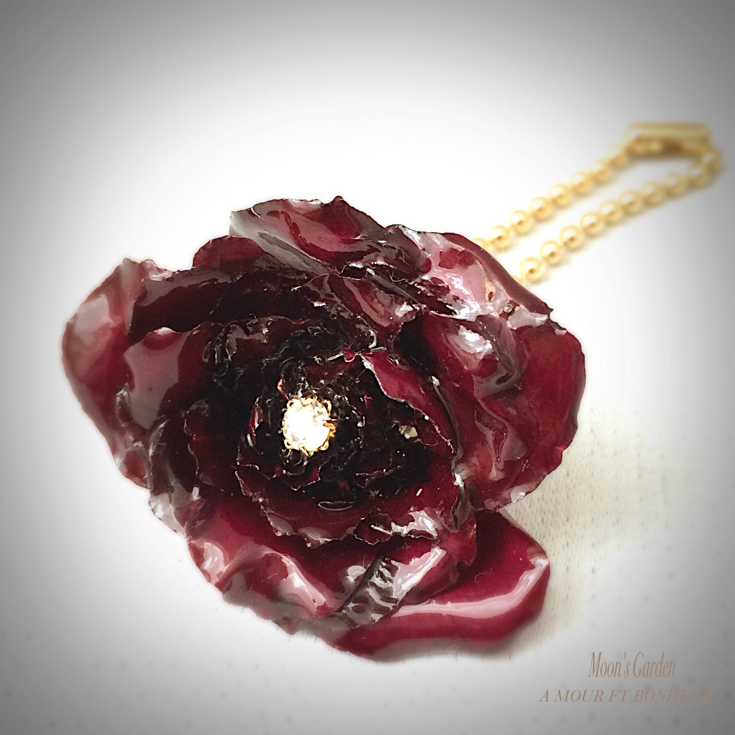 このビロード調の濃赤色の花弁は加工するとブラックレッドになります。花弁の中心には月明かりのようにほのかな白い輝きを放つ上品なカラーのスワロフスキー・ムーンライトを使用し、エレガントな雰囲気に仕上げました。