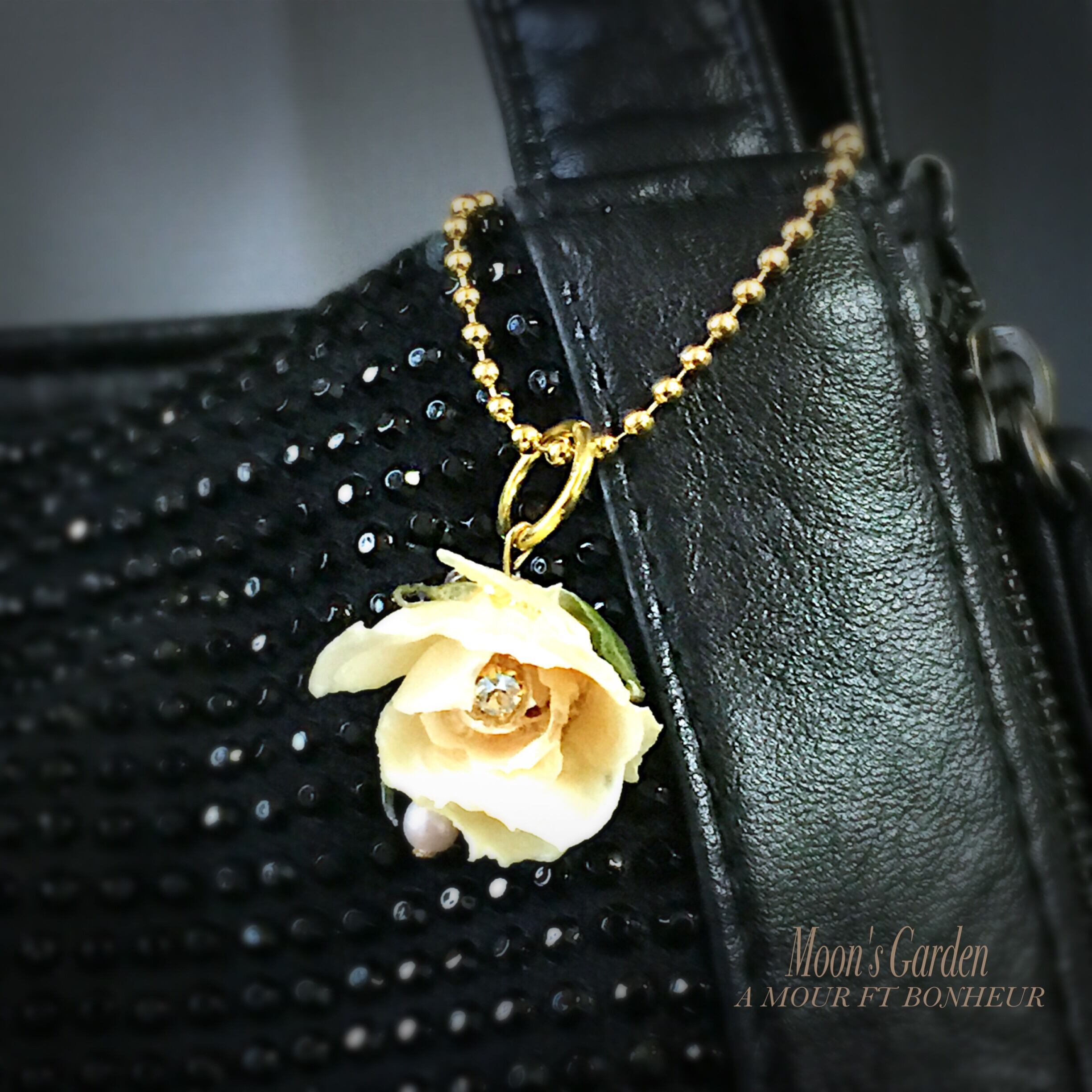 薔薇の下で揺れる淡いピンク色のパールが上品なイヤフォンジャックアクセサリーに仕上げました。