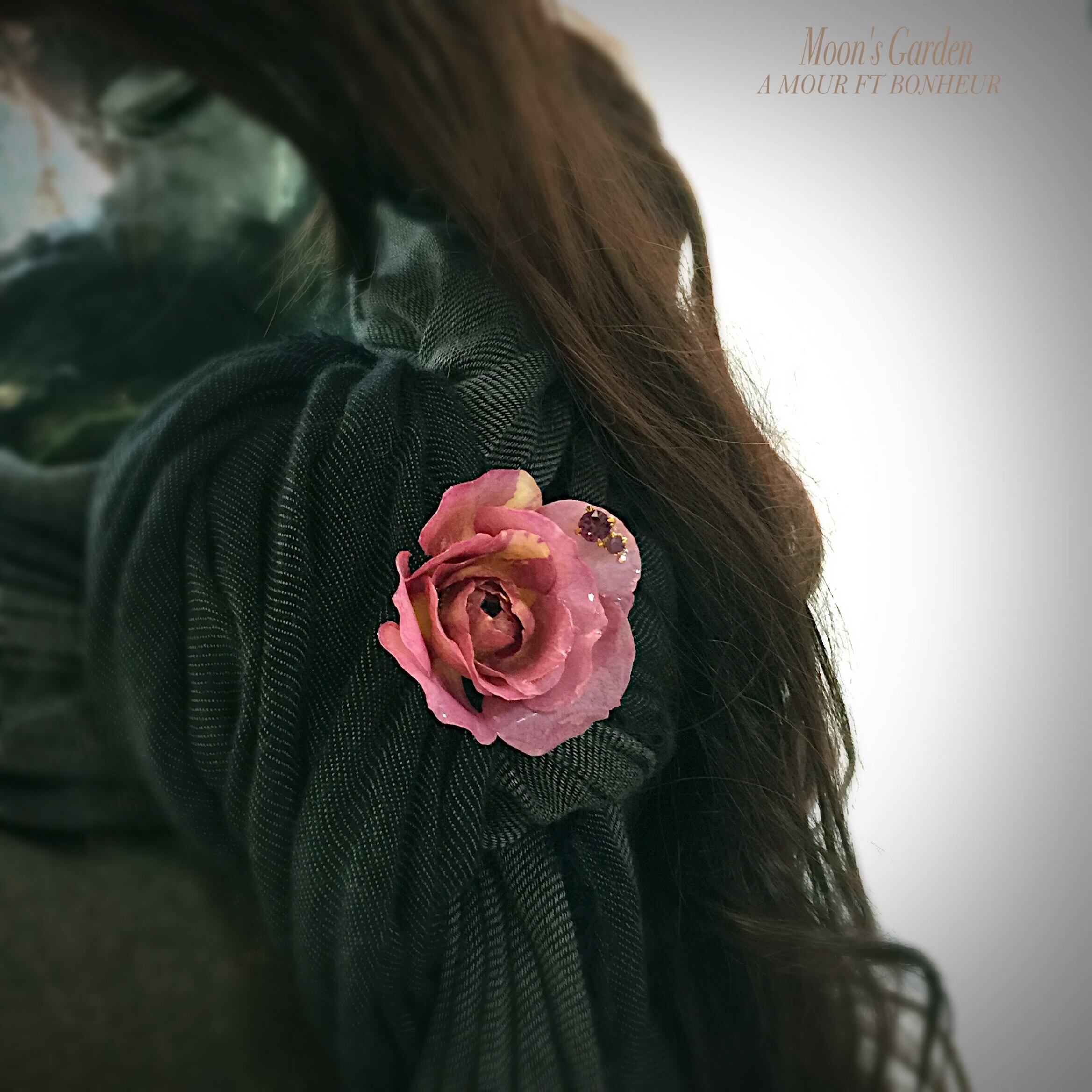 紫がかったローズカラーの花弁には絞りが綺麗に入っており、花弁の縁にはスワロフスキーアメジスト&シクラメンオパール&ひそかに輝くオーロラカラーのクリスタルを加え、可愛いい丸い薔薇にエレガントな雰囲気をプラスしました。