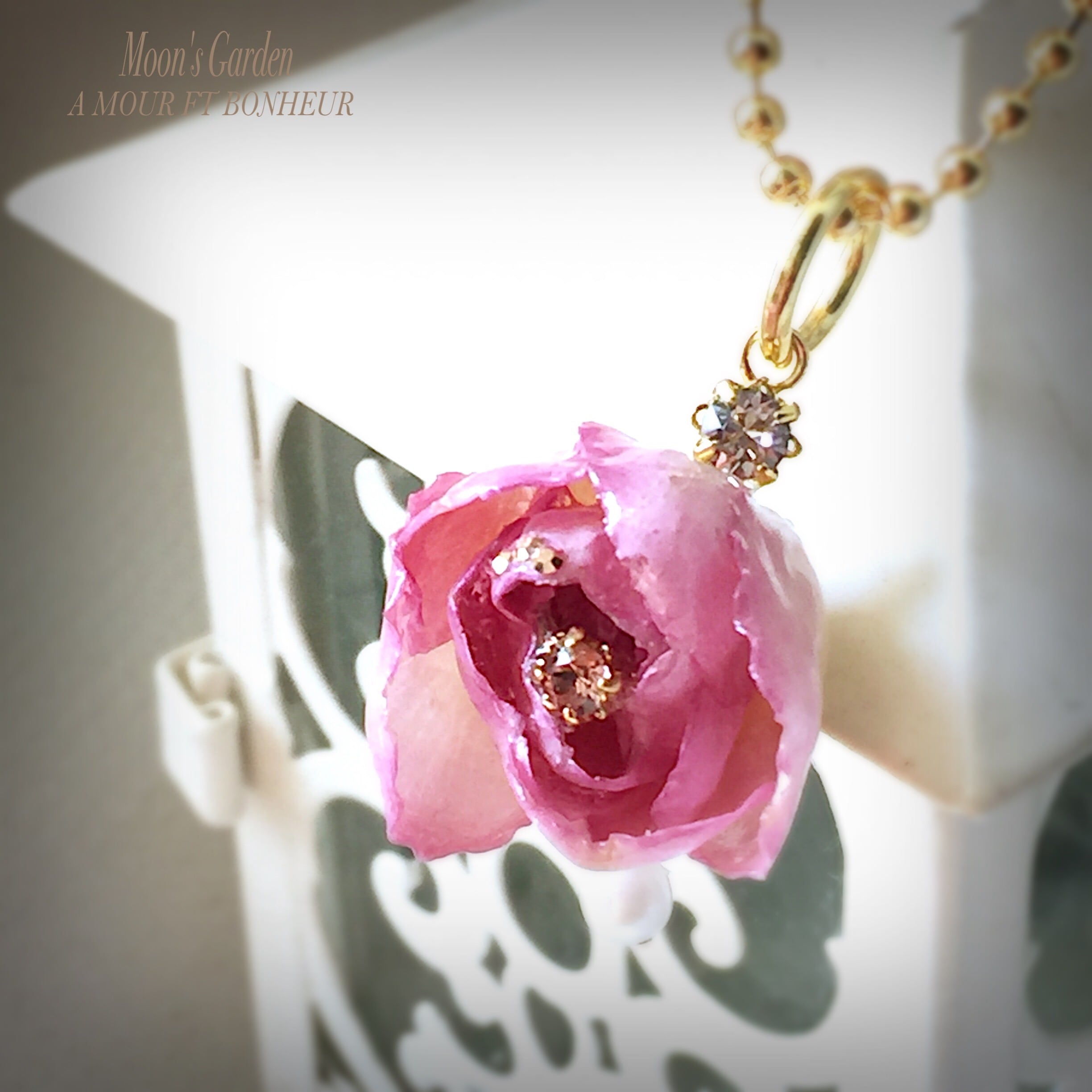 さりげない煌めきとコロンと可愛い小さなピンクの薔薇のイヤフォンジャックピアスに仕上げました。
