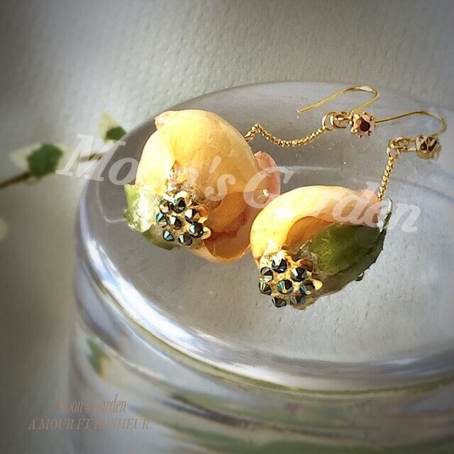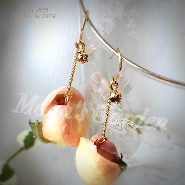 淡いアプリコット色の小さな蕾が少し膨らみかけた状態を使用した可愛いピアスです。